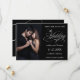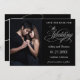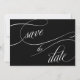 Envie um casamento elegante Salve o cartão de Data que apresenta belos destaques do texto do roteiro de caligrafia com sua data de casamento e sua cidade. O texto prateado contrasta lindamente com o fundo negro moderno. Um modelo de foto está incluído nesta design para que você carregue sua foto de orientação vertical desejada para personalizar esta placa com uma foto de noivado ou outra imagem escolhida da futura noiva e noiva.