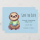 Cartão de salvar a data com uma ilustração adorável apresentando uma preguiça feliz vestindo uma camiseta verde.