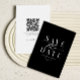 Este elegante salvamento da data design apresenta um esquema de cores preto e branco e uma moderna opção de código QR para fornecer suas informações de casamento futuras. Este design é totalmente personalizável com o seu texto e URL para o código QR.