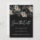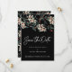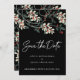 Uma bela e elegante caligrafia escreve Salve a Data em letra cursiva branca. Ela se destaca contra o fundo preto escuro. Belas flores brancas de inverno estão aninhadas em folhagens verde-escuras e frutos vermelhos.