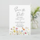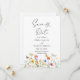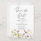 Flores silvestres e borboletas coloridas criam um design botânico rústico para salvar as datas. Flores amarelas, laranja, rosa e azuis dançam pelo fundo. As fontes serif e cursivas somam a este design maravilhosamente clássico.