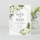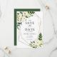 Anuncie sua data de casamento com este floral branco. Apresenta ilustrações em aquarela de rosas brancas e peônias, sotaques folínicos e falso quadro geométrico de folha de ouro. Este branco brilhante floral, para salvar o cartão de data, é perfeito para primavera e casamentos no inverno. Personalize adicionando nomes, data, local e outros detalhes do evento.
