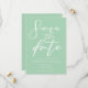 Este verde-macio Salve o cartão de data apresenta tipografia branca-chic para uma doce cerimônia de primavera ao ar livre. Script simples e elegante em um convite verde pastel sólido tranquilo para um local de jardim.