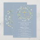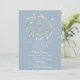 Uma grinalda decorativa de folhagem e uma cruz dourada repousam sobre as informações de save the date da sua primeira comunhão especial num fundo azul poeirento.
