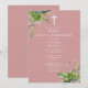 Este convite de primeira comunhão rosa poeira botânico de folhagem de eucalipto elegante pode ser personalizado com sua informação em tipografia chic com iniciais de monograma no verso. Criado por Thisisnotme
