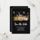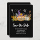 Salve o cartão de data com uma bela imagem de abóbora e abrigos com fantasmas e morcegos voando.