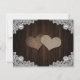 Romantic rustic purple and blue floral photo wedding save the date card featuring hydrangea flowers, string lights and elegant floral lace against a barn wood background. There are two burlap hearts and white floral lace on rustic wood background at the back.