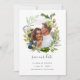 Elegante botânico salva as datas tem uma foto de noivado favorita cercada por uma coroa redonda de bolota e folhas em uma elegante paleta de aquarelas cinza e verde com flores azuis sólidas. Personalize com seus nomes, data do casamento e local.