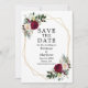 Moderno Elegante Watercolor Burgundy Noivado Floral Anúncio de Casamento Salvar O Cartão de Data inclui peões, lírios, folhas de eucalipto e outro belo verde numa armação geométrica de ouro.