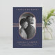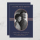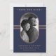 Estes cartões salve a data elegantes apresentam um quadro de ouro falso e arredondado em rosa de volta da sua foto pessoal, com linhas geométricas correspondentes e texto moderno em um fundo azul escuro e marinho.