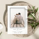 Um moderno e minimalista salva a design com sotaques geométricos. Sua foto vertical é enquadrada por uma dupla borda geométrica em preto suave, com seus detalhes de casamento embaixo. Um sotaque de escrita de caligrafia etérea adiciona um toque de suavidade a este design simples e mínimo. Adicione detalhes adicionais à parte de trás coordenada por cores, como o site do seu casamento.