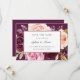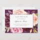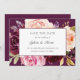 Moody floral, guarde o cartão de data com rosas pintados a aquarela em tons de ameixa, pêssego e rosa sobre um fundo de ameixa. Os detalhes do seu casamento estão em um quadro branco retangular que sobrepõe as flores. A parte de trás tem uma buquê de rosas no meio, sobre a mesma sombra de ameixa. Este design elegante é excelente para uma celebração no outono.
