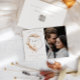 Um belo casamento outono, exceto a data com uma crista de escudo gravada à mão, enfeitada com flores e folhas de pêssego, de cor aquática, com seu monograma e data de casamento na cinza. Sua foto está à direita. Ao contrário, adicione os detalhes do seu site de casamento com o código QR.