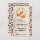 Um cartão de encontro com um desenho de uma raposa fofa adormecida pacificamente. Uma coroa de folhas verdes atrás e alguns corações flutuando por aí. O fundo é um padrão com bolinhas claras e macarões coloridos colocados sobre cima