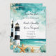 Lindo cartão de casamento com um farol náutico preto e branco, estrela-do-mar e conchas. Perfeito para um casamento. As palavras podem ser alteradas para se adequar aos seus próprios detalhes ou requisitos
