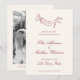 The save the date card features an off white background, offering a serene and classic canvas that enhances the minimalist design. The elegant dark red font, inspired by vintage calligraphy, adds a touch of sophistication and warmth. This carefully selected typography complements the artistic elements, ensuring your wedding details are presented with style and clarity.