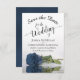 Este casamento Salve o cartão de data é romântico, elegante, elegante e bonito. Ele apresenta uma fotografia de um rosa de aço empoeirado e poeirento, solteiro de cor azul, que se apresenta em uma piscina de água com ondas e ondulações. O texto é uma caligrafia de script de rico sobre fundo branco. As costas apresentam um adorável padrão marmoreado. Maneira perfeita de deixar seus amigos e família saberem sobre seu próximo casamento.