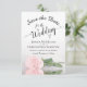 Este casamento Salve o cartão de data é romântico, elegante, elegante e bonito. Apresenta uma fotografia de um rosa cor-de-rosa-rosa, pincelado, com solteiro longo e empilhado, refletindo numa piscina de água com ondas e ondulações. O texto é uma caligrafia de script de rico sobre fundo branco. As costas apresentam um adorável padrão marmoreado. Maneira perfeita de deixar seus amigos e família saberem sobre seu próximo casamento.