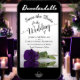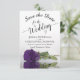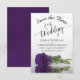 Este casamento Salve o cartão de data é romântico, elegante, elegante e bonito. Apresenta uma fotografia de um solteiro roxo, há rosa, que se reflete numa piscina de água com ondas e ondulações. O texto é uma caligrafia de script de rico sobre fundo branco. A parte de trás apresenta um padrão roxo marmoreado profundo. Maneira perfeita de deixar seus amigos e família saberem sobre seu próximo casamento.