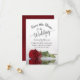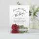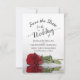 Este casamento Salve o cartão de data é romântico, elegante, elegante e bonito. Apresenta uma fotografia de uma rosa vermelha enfeitada de solteiro longo, refletindo numa piscina de água com ondas e ondulações. O texto é uma caligrafia de script de rico sobre fundo branco. A parte de trás apresenta um padrão vermelho ou arrojado. Maneira perfeita de deixar seus amigos e família saberem sobre seu próximo casamento.