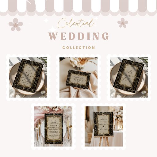 Embrace timeless elegance with this Golden Celestial Baroque Wedding design, featuring a rich navy and parchment backdrop adorned with radiant suns, swirling stars, and ornate celestial flourishes. The perfect choice for couples seeking a regal and otherworldly wedding aesthetic, blending the romance of the cosmos with luxurious vintage artistry. Ideal for celestial, astrology, or night-sky-themed weddings.