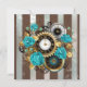 Relógio antigo e patenteado, adornado com joias, mãos de ouro e algarismos latinos com rosa de turquesa sobre fundo castanho e listrado. Estilo Steampunk.