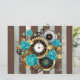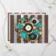 Relógio antigo e patenteado, adornado com joias, mãos de ouro e algarismos latinos com rosa de turquesa sobre fundo castanho e listrado. Estilo Steampunk.