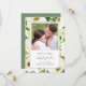 Foto floral elegante, salvar o cartão de data em espanhol, com rosas brancas pintadas à mão e verde que cobrem todo o lado frontal. Sua foto quadrada e detalhes do casamento estão em um quadro retangular branco que sobrepõe as flores. A parte traseira é uma forma correspondente de verde e pode ser alterada para qualquer cor desejada. Esta design é perfeita para um casamento no jardim no verão.