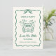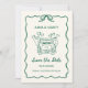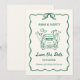 Prepare-se para anunciar o seu casamento de uma forma divertida e inesquecível com este cartão Save the Date caprichoso e ilustrado à mão! Perfeito para os casais modernos e estilosos de hoje, este design atual é criado com um estilo único e casual que traz alegria e personalidade ao anúncio do seu casamento. A ilustração apresenta um carro de casamento clássico com balões em forma de coração, adicionando um toque leve que reflete a emoção da sua celebração futura. Enquadrado em uma borda delicada e ondulada com um laço encantador no topo, o charme vintage deste design é realçado por uma cor verde fresca e vibrante, tornando-o uma escolha perfeita para casais que amam uma mistura de romance clássico e simplicidade moderna.