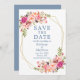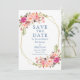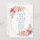 Elegante Watercolor Pink Blush Floral Save O Cartão de Anúncio de Casamento de Data inclui rosas cor-de-rosa e verde botânico numa moldura geométrica dourada. Texto Azul Dusty.