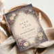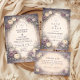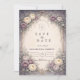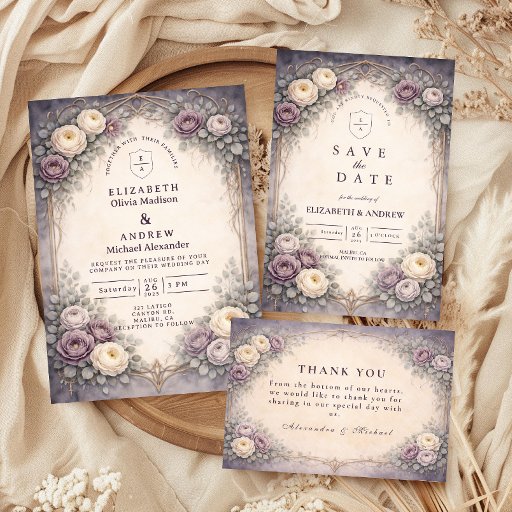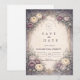 A softer take on gothic elegance, this design blends vintage romance with delicate pastel florals in shades of dusty lavender, ivory, and muted sage. An ornate gold baroque frame gently surrounds a warm parchment center, creating a refined contrast against the smoky, textured background. Lush roses and layered blooms add depth while maintaining an airy, balanced composition. Perfect for couples who love the mood of gothic style but want a more ethereal, romantic interpretation with timeless sophistication.