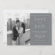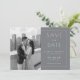 This wedding save the date features a split design with a black-and-white photograph of a couple embracing on a balcony overlooking a cityscape, paired with a modern gray panel for text. The layout is clean and balanced, using sans-serif typography to convey important details in an elegant manner. The monochromatic color palette enhances the contemporary aesthetic, creating a harmonious blend of personal sentiment and formal announcement. Perfect for couples seeking a stylish and sophisticated way to share their upcoming nuptials.