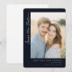 This wedding save the date card features a romantic and serene design with a rectangular layout, framed by a dark navy border. The central image captures a warm, candid moment between two individuals in an outdoor setting during sunset or sunrise, highlighted by soft golden light. Elegant cursive script reads "Save the Date" vertically on the left, while clean serif fonts display names and details at the bottom, adding a timeless touch. The color palette of golds, yellows, blues, and greens creates a harmonious balance, evoking warmth and intimacy perfect for special occasions.