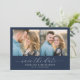 This wedding save the date card features a split layout with two intimate photos, set against a deep navy blue background that enhances the warm tones of the subjects' clothing. The design employs a contemporary and elegant style, using soft, natural lighting to create a romantic feel. A script font adds sophistication at the bottom, where customizable text fields allow for personalization. The overall mood is one of warmth and anticipation, making it perfect for sharing an upcoming celebration.