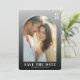 This wedding save the date card features a minimalist and elegant design with an arched top border framing a central photo placeholder. The color palette includes neutral tones of light gray, white, black, and hints of warm beige and brown from the image, creating a serene aesthetic. Bold serif typography highlights "SAVE THE DATE" on a solid black background, while customizable fields for names and dates are presented in clean sans-serif fonts. The overall mood is romantic and intimate, perfect for formal occasions, capturing anticipation and warmth.