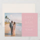 This wedding save the date card features a split design with a romantic beach scene on one side and a soft pink background on the other. The layout is modern and minimalist, emphasizing elegance through clean lines and ample negative space. A couple stands facing each other against a backdrop of ocean waves and palm trees, capturing a serene and dreamy atmosphere. The typography uses a sleek sans-serif font, with varying weights to highlight key details, creating a warm and inviting tone perfect for announcing an upcoming celebration.