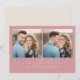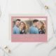 This wedding save the date features a split composition with two identical photos of a couple in an outdoor setting, framed by a soft pink background. The design showcases a romantic and candid style, emphasizing genuine emotion with warm tones and natural colors from their casual attire. Elegant script typography announces "save the date," while a simple serif font provides customizable space for names and details. The overall mood is one of joy and anticipation, perfect for sharing your special news with loved ones.