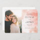 This Save the Date card features a warm, romantic design with a split layout. The left side showcases a soft-focus photo of two people smiling together, set against an outdoor backdrop, while the right side displays elegant text on a watercolor background in shades of pink and peach. The typography combines bold script for the names with clean serif fonts for additional details, creating a sophisticated yet inviting look. Perfect for setting the tone for a wedding celebration, this design exudes warmth and anticipation.