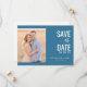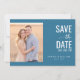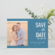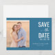 This wedding save the date card features a modern and minimalistic design with a split layout. The left side showcases a warm, candid photograph of two people in an outdoor setting during sunset or sunrise, while the right side presents bold, clean typography on a deep teal background. The text is arranged hierarchically, using a mix of sans-serif and script fonts to emphasize key details. The overall mood is one of anticipation and celebration, making it perfect for sharing important personal news with friends and family.