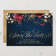 (Pedido personalizado)O casamento floral romântico elegante e moderno com aquarelas salve os cartões de data com um buquê de burgundy / marsala, cor-de-rosa pincel, púrpura, cor de água de pêssego com folhagem correspondente em fundo azul marinho. Perfeito para um casamento no outono/no meio do verão. Por favor, encontre mais designs e variações na minha loja de "blisswedingpaperie". E sinta-se à vontade para contactar-me para mais personalizações ou itens correspondentes