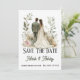 Anuncie seu dia especial com este incrível cartão Save The Date com uma cena botânica quente e uma ilustração romântica de noiva e noivo.