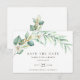 Anuncie seu dia especial com este romântico guarde o cartão de data. Apresenta um elegante eucalipto verde num fundo branco macio. Perfeito para jardins, ao ar livre ou casamentos minimalistas. Totalmente personalizável com seus detalhes de casamento.