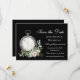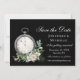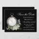 Casamento elegante de preto e branco Salve a data retrata um simples design de aquarela com um relógio antigo, uma rosa branca e verde sobre fundo preto.