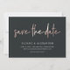 Um cartão de data moderno, projetado para casais de escala superior ou casamentos urbanos. "Save the date" (Salvar a data) aparece em letra falsa rosa dourada, escrita à mão. Personalize com seus nomes, data do casamento e local do casamento embaixo de letras brancas em um fundo preto macio.