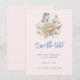 Cartão de salvar a data com uma bela rosa em cores pastéis sonhadoras. Uma borboleta adeja por perto. Pequenos flocos de falso ouro dão a esta imagem uma qualidade mágica de fantasia.