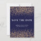 Elementos: folha de ouro rosa real, fontes serif clássicas, design de poeira estelar. Cores: marinho azul, rosa, branco. Temas: romântica, cerimônia noturna, moderna, caprichosa, luxuosa, glam, estrelas, astronomia, elegante, sofisticada. Coleção: Rosa romântico para Marinho Dourado de Stardust Tipo de Produto: Salvar Data