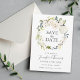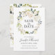 Mande um casamento encantador, salve os cartões de data com uma delicada camada branca de cor-d-água, coroa floral de rosas, hortênsias, florais mistos e vegetação rasteira. Uma face moderna escrita à mão soletra os nomes da noiva e do noivo lindamente. A parte de trás do cartão tem florais correspondentes.