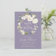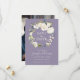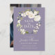 Mande um casamento encantador, salve os cartões de data com uma delicada camada branca de cor d'água, coroa floral de rosas, hortênsias, florais mistos e verde à deriva sobre um fundo roxo lavanda popular. Um moderno tipo de escrita manual mostra os nomes da noiva e do noivo lindamente. A parte traseira do cartão tem um modelo de foto para carregar a foto desejada.