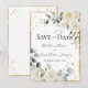 Lindas rosas brancas elegantes & minúsculas margaridas rodeadas por uma moldura rústica dourada & folhagem mista de eucalipto com outras folhas de aquarela convite de casamento. O fundo branco limpo adiciona à elegância deste adorável design. Impressionante. Salpicos dourados falsos na frente & verso para criar um visual chic.