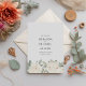 Casamento botânico elegante salve a data com uma fronteira de rosas brancos e marfim primitivos e folhas gentis sobre o fundo branco clássico e seus nomes e todos os detalhes especiais de casamento escritos em uma cinza clássica. O reverso da placa tem um buquê pequeno na parte inferior. Quer você esteja planejando uma comemoração chica de verão ou um caso romântico de primavera, esta salva a data define o tom perfeito para seu dia especial.